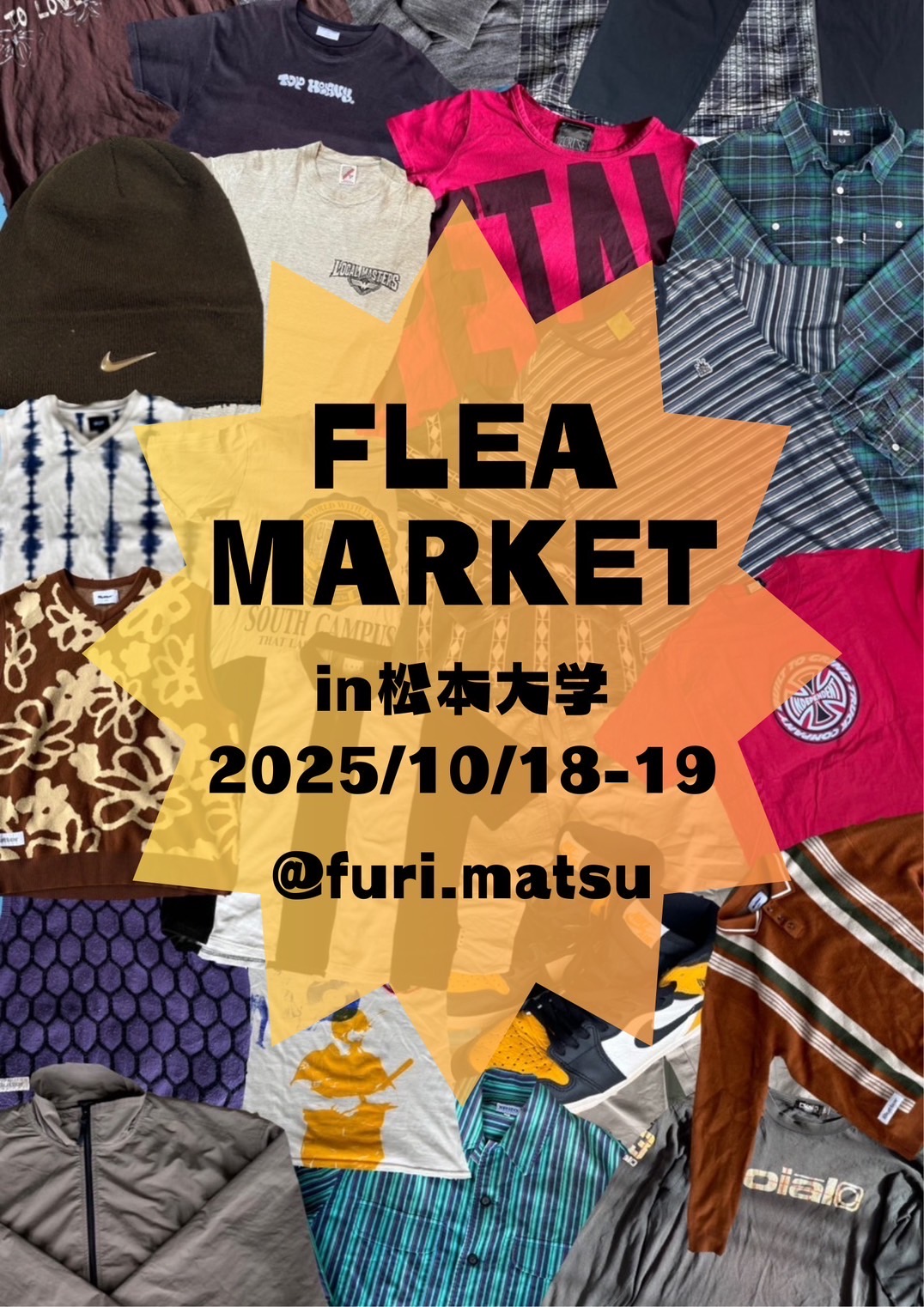服が好きな観光学科4年生が学祭を通して松本のファッション偏差値を上げようということで企画したイベントです!フリマみたいな感じでかなり安く、値下げ交渉もありとなっています!ストリート系やアメカジ、モード系、Y2K、デザイナーズも多々あります!服の詳細はインスタ@furi.matsuで検索!